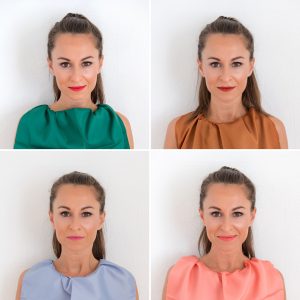 Játszottunk picit, a négy évszaktípus egy-egy jellemző árnyalatát, és rúzsát öltöttem magamra, és szerintem nagyon látványosak lett a különbségek. Az első képen levő színek ismerősek lehetnek, -hisz azok az én színeim -tél típusként. A színtípus besorolás a természetes adottságokon alapul, vagyis nagyon leegyszerűsítve, olyan árnyalatokat lenne érdemes viselnünk, amik leginkább visszatükrözik természetes adottságainkat. Ezért, ha valamin azt érzed sápaszt, vagy furcsán áll, öregít, vagy valamiért sosem vonzódtál hozzá, jó eséllyel nem a te színed. A tanácsadás során végigmegyünk egy színcsoport különböző árnyalatain, és a legvégén kapunk egy palettát, ami önmagában is gyönyörű harmóniát ad, így az öltözködésedben a színek kombinációját nagyban megkönnyíti.